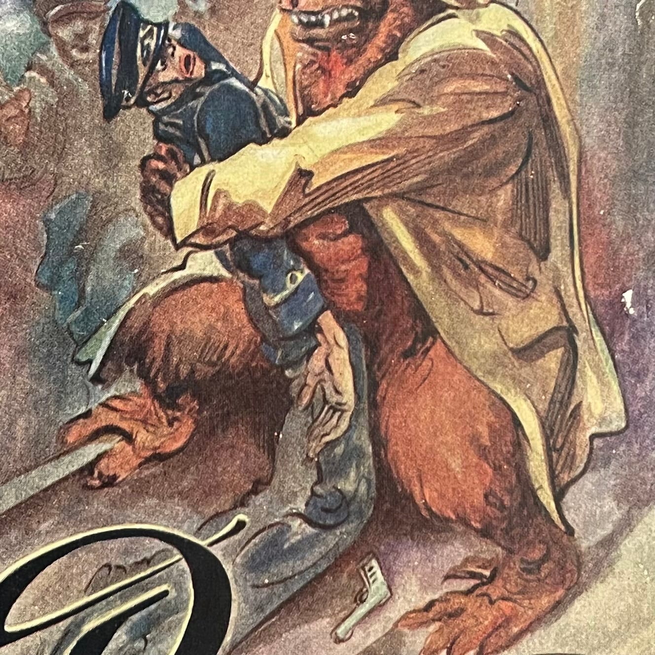 Det är boven, mannen i den blå uniformen, som tappat revolvern. Inte apan. Apor, vare sig de är orangutanger eller gorillor, behöver inte vapen för att hantera människor. Många män tror att de skulle kunna klara sig mot en björn i obeväpnad kamp. De har fel, men det skulle vara kul att se. En björn skulle eventuellt kunna spöa upp en orangutang, men nu är vi ute på ett stickspår. Tillbaka!