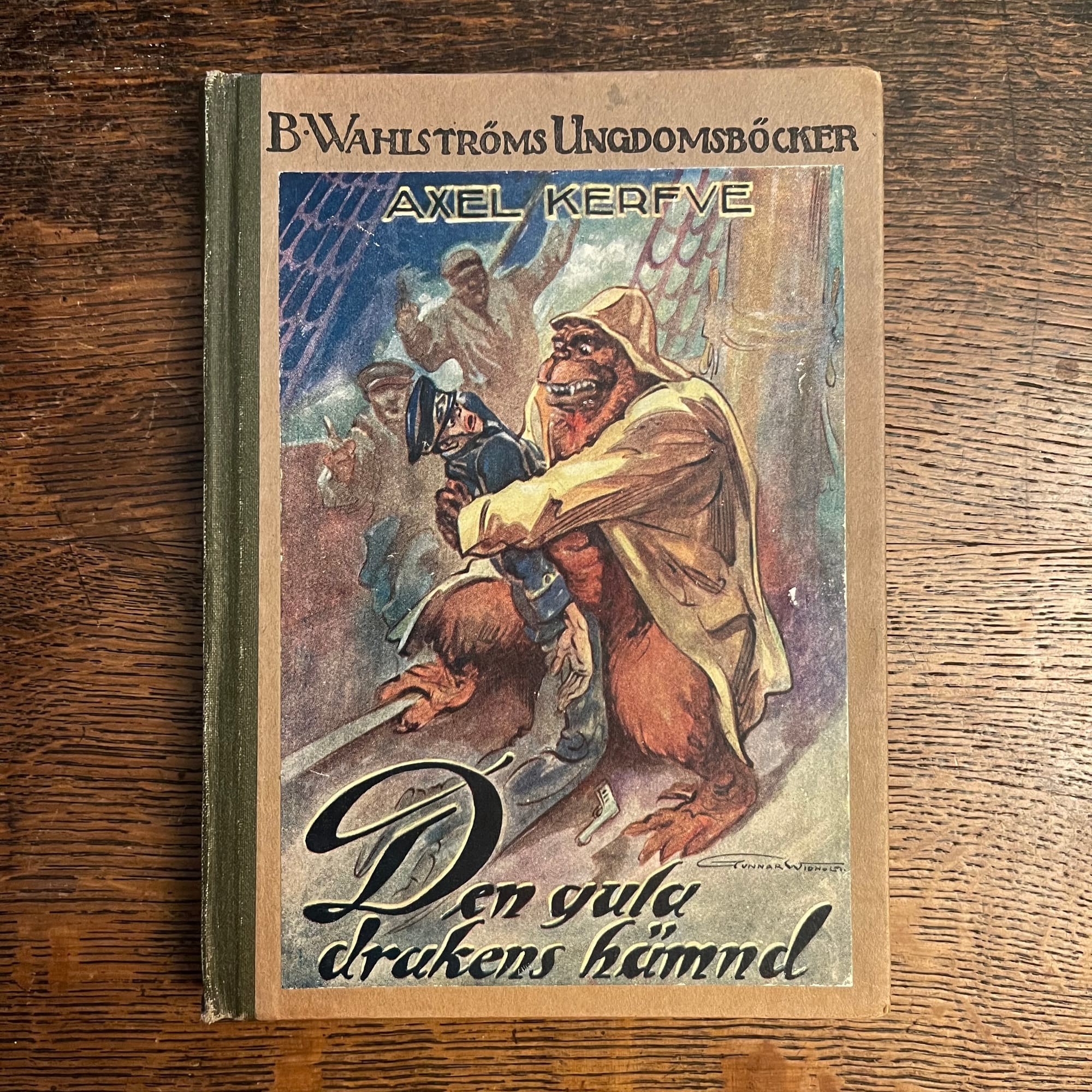 Boken är Den gula drakens hämnd, av Axel Kerfve, den är utgiven som nummer 128 i serien B. Wahlströms ungdomsböcker, 1929. Vad jag vet kom den bara i en upplaga, men är trots det inte ovanlig antikvariskt.