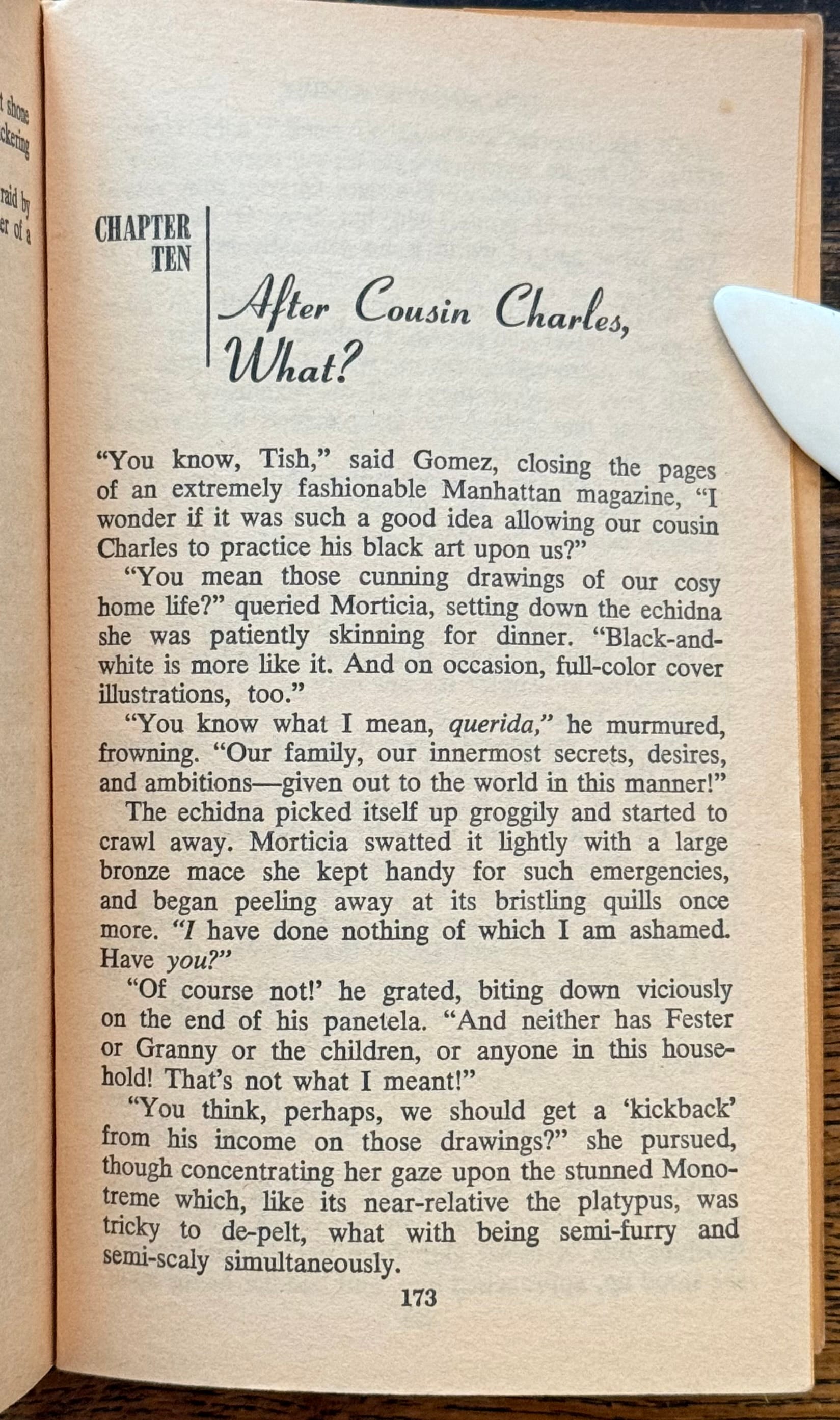 Gazing fondly at her husband, Morticia dropped her echidna. "Oh, my dearest, you are upset, aren't you!" Brushing bits of moist glop from her delicate fingers, she stood up, approached him, and laid her hands upon his shoulders. "I was saving this for an anniversary surprise, but—I suppose I should tell you now. What joy in delighting you later if you must suffer through an interim of agonizing chagrin?"