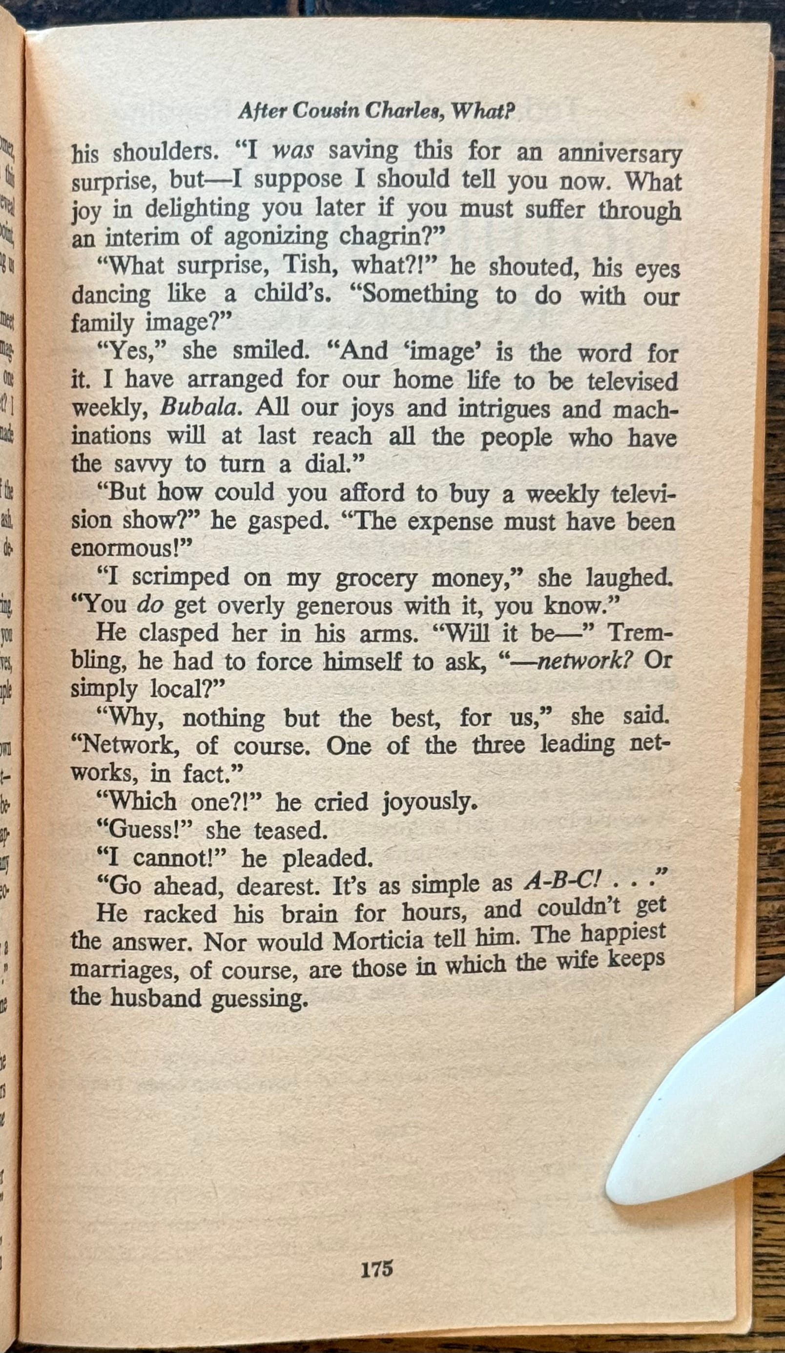 "Yes," she smiled. "And 'image' is the word for it. I have arranged for our home life to be televised weekly, Bubala. All our joys and intrigues and machinations will at last reach all the people who have the savvy to turn a dial."