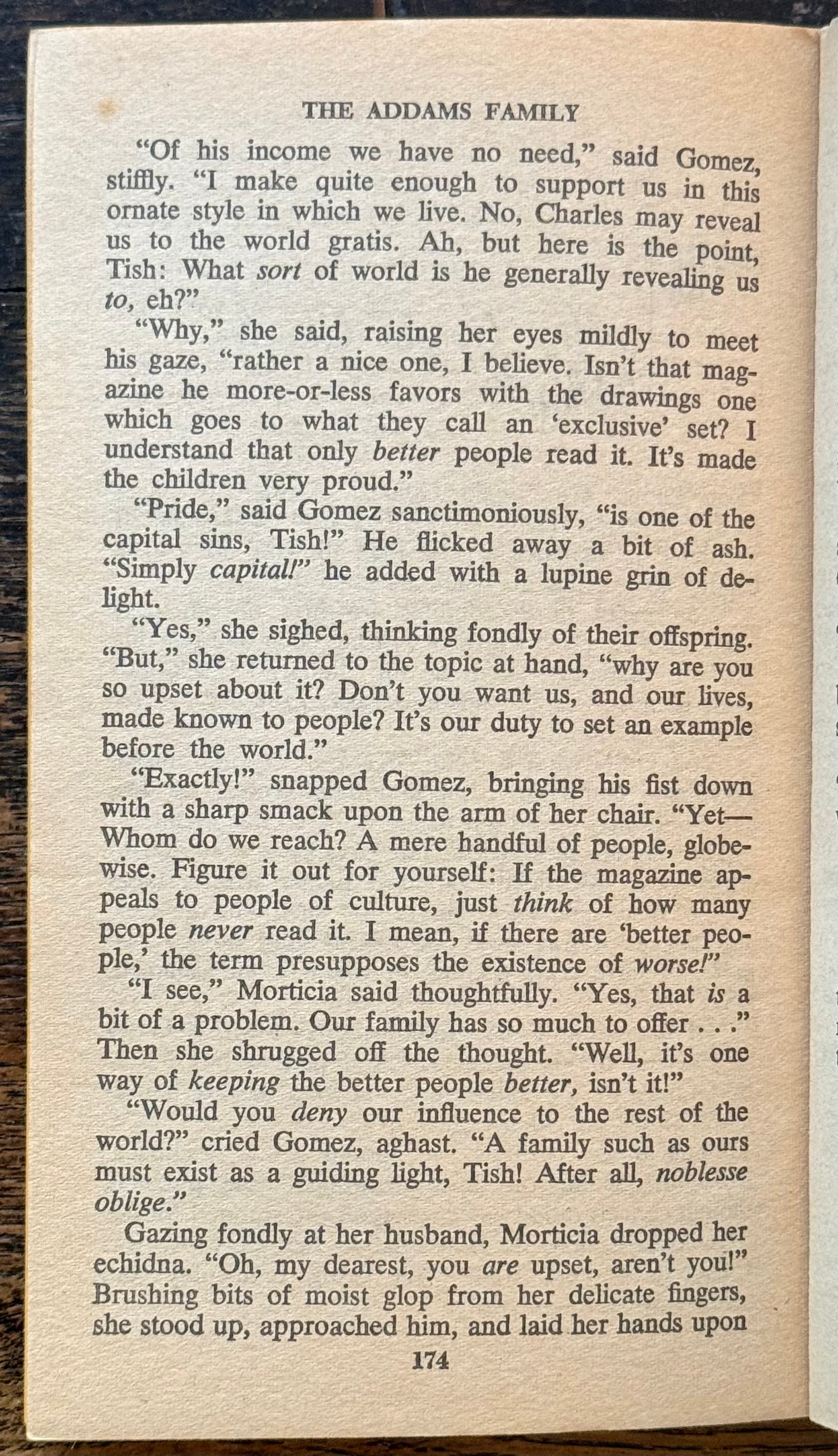 "Would you deny our influence to the rest of the world?" cried Gomez, aghast. "A family such as ours must exist as a guiding light, Tish! After all, noblesse oblige."