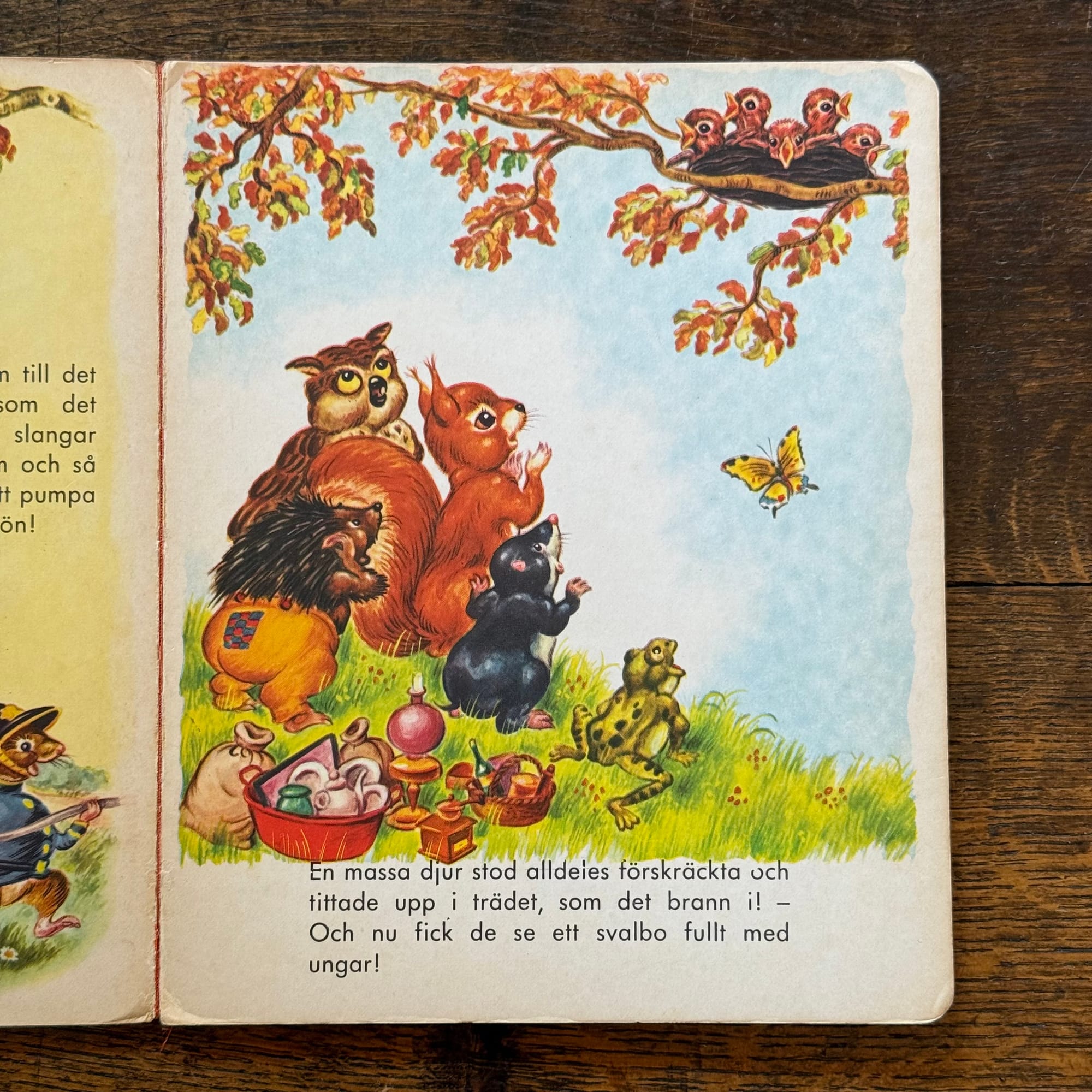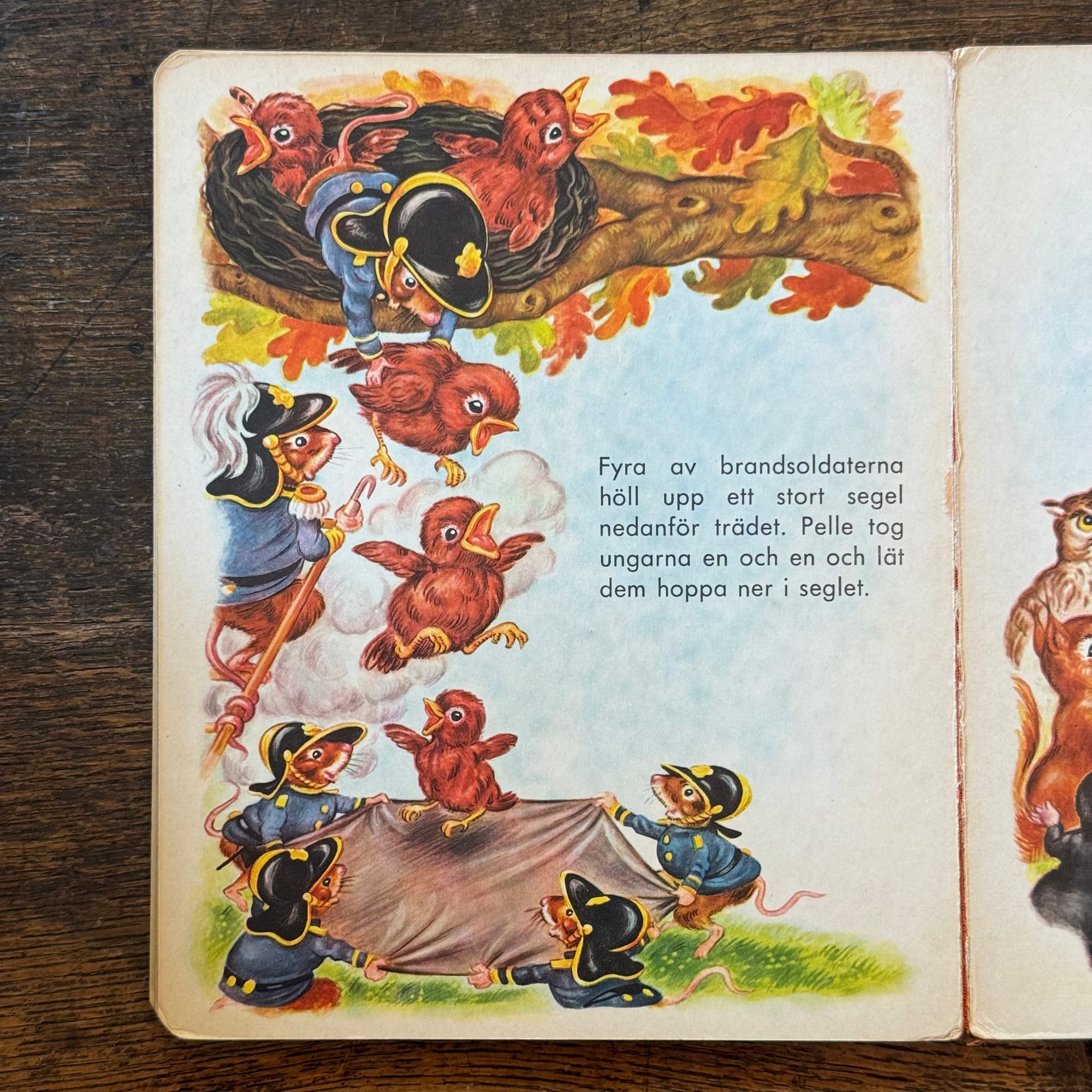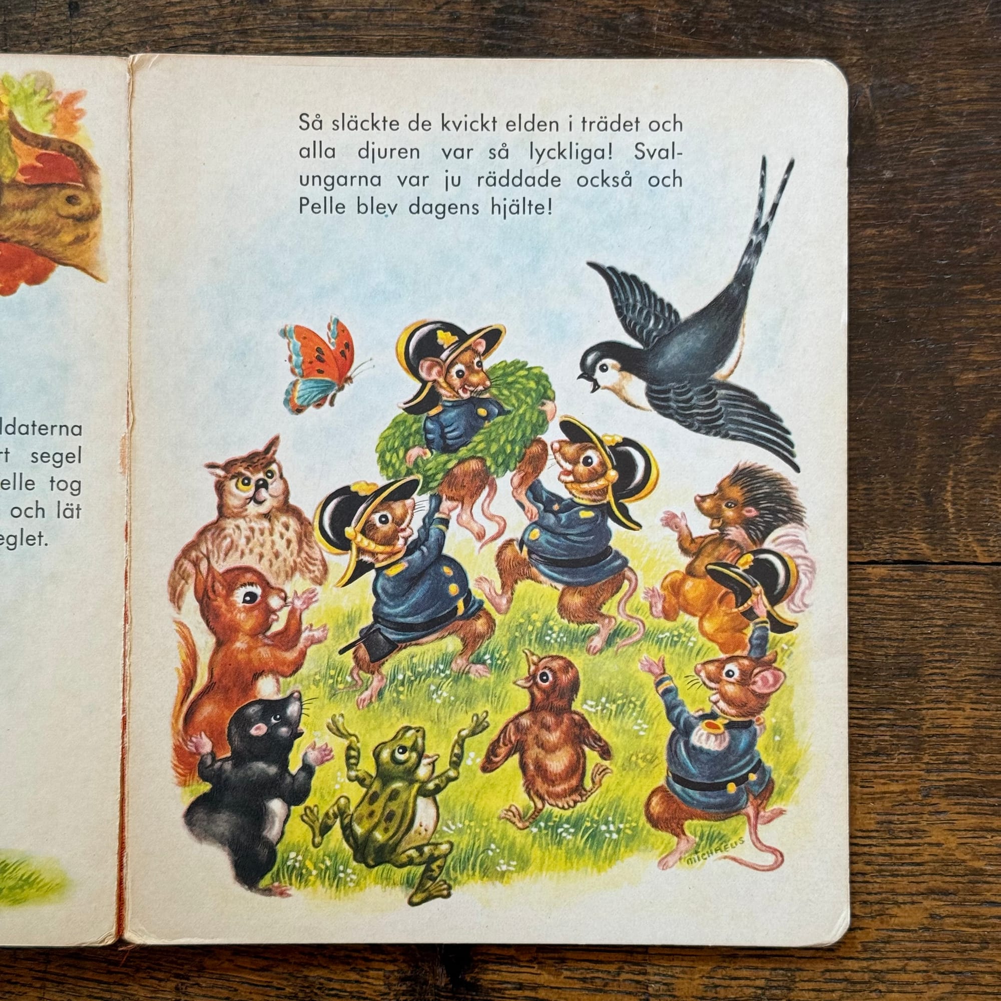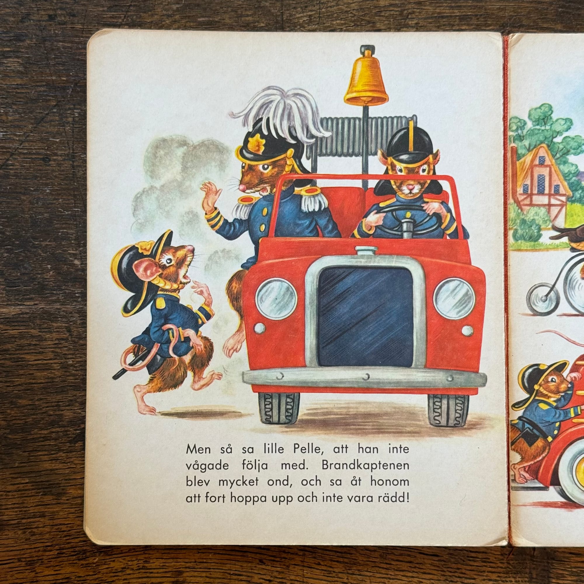 Musbrandbilen rycker utEn dag när alla brandsoldaterna satt och åt middag, kom svalmamman inflygande och ropade pá hjälp! – Det brann i ett stort träd!Alarmklockorna började ringa och brandsoldaterna åkte ned för stången och kastade sig in i den röda, fina brandbilen.Men så sa lille Pelle, att han inte vågade följa med. Brandkaptenen blev mycket ond, och sa åt honom att fort hoppa upp och inte vara rädd!De körde mycket fort och tutade och plingade allt vad de kunde. Apan August försökte cykla ikapp brandbilen, men det lyckades inte.Så kom de fram till det stora trädet, som det brann i. Alla slangar kom kvickt fram och så hjälptes de åt att pumpa upp vatten ur sjön!En massa djur stod alldeles förskräckta och tittade upp i trädet, som det brann i! – Och nu fick de se ett svalbo fullt med ungar!Brandkaptenen reste upp den längsta stegen mot boet. – Men den räckte inte! – Då tog svalan en brandsoldat på ryggen och flög upp till boet!Brandsoldaten – minsann var det inte Pelle – landade lyckligt på grenen bredvid boet. Han lugnade ungarna och sa, att nu skulle de snart bli räddade.Fyra av brandsoldaterna höll upp ett stort segel nedanför trädet. Pelle tog ungarna en och en och lät dem hoppa ner i seglet.Så släckte de kvickt elden i trädet och alla djuren var så lyckliga! Svalungarna var iu räddade också och Pelle blev dagens hjälte!Bakre omslag, identiskt med främre så när som på förlagsloggan, se närmre nästa bild.Mulder, mjölnare på holländska, ett internet-anonymt holländskt förlag jag inte vet något om.