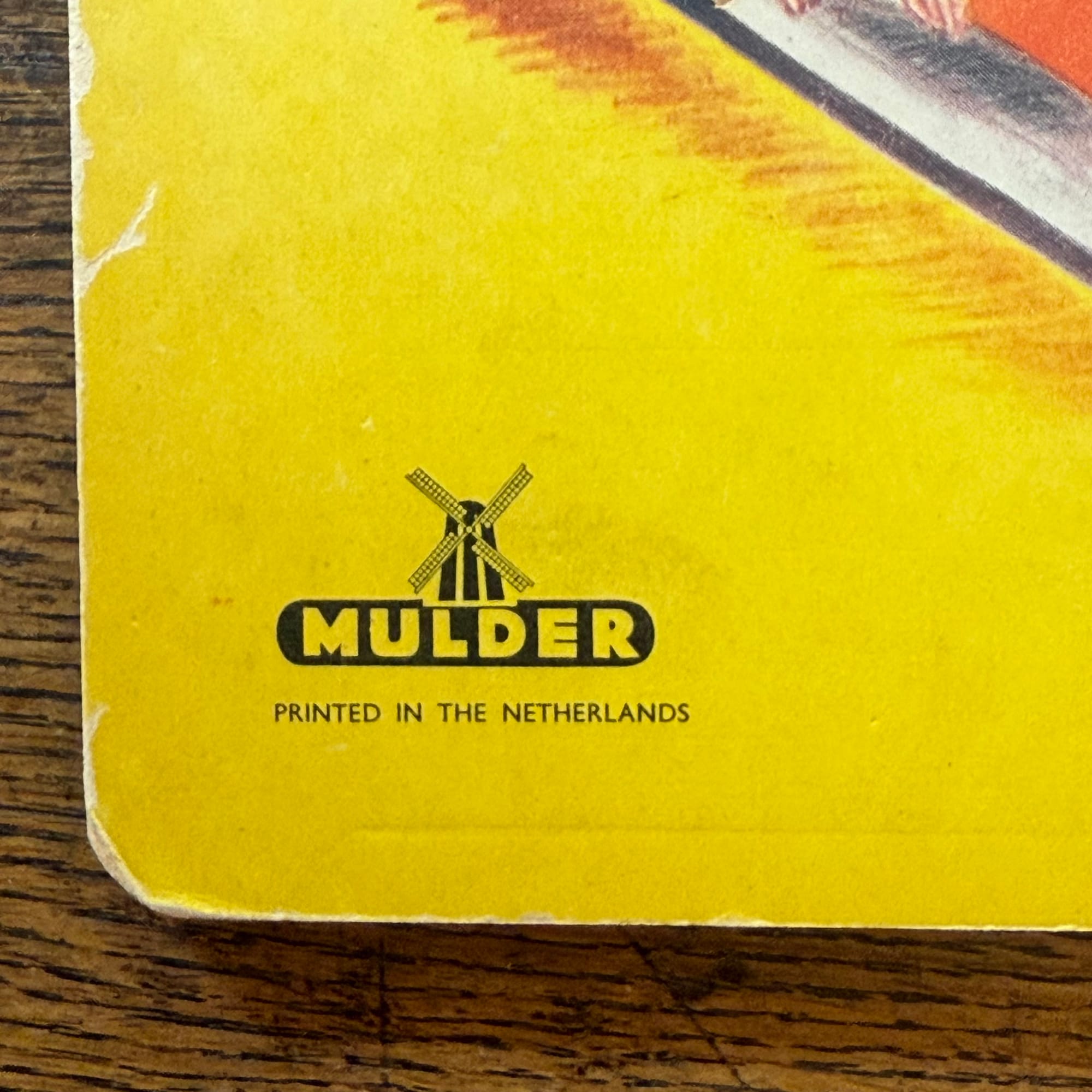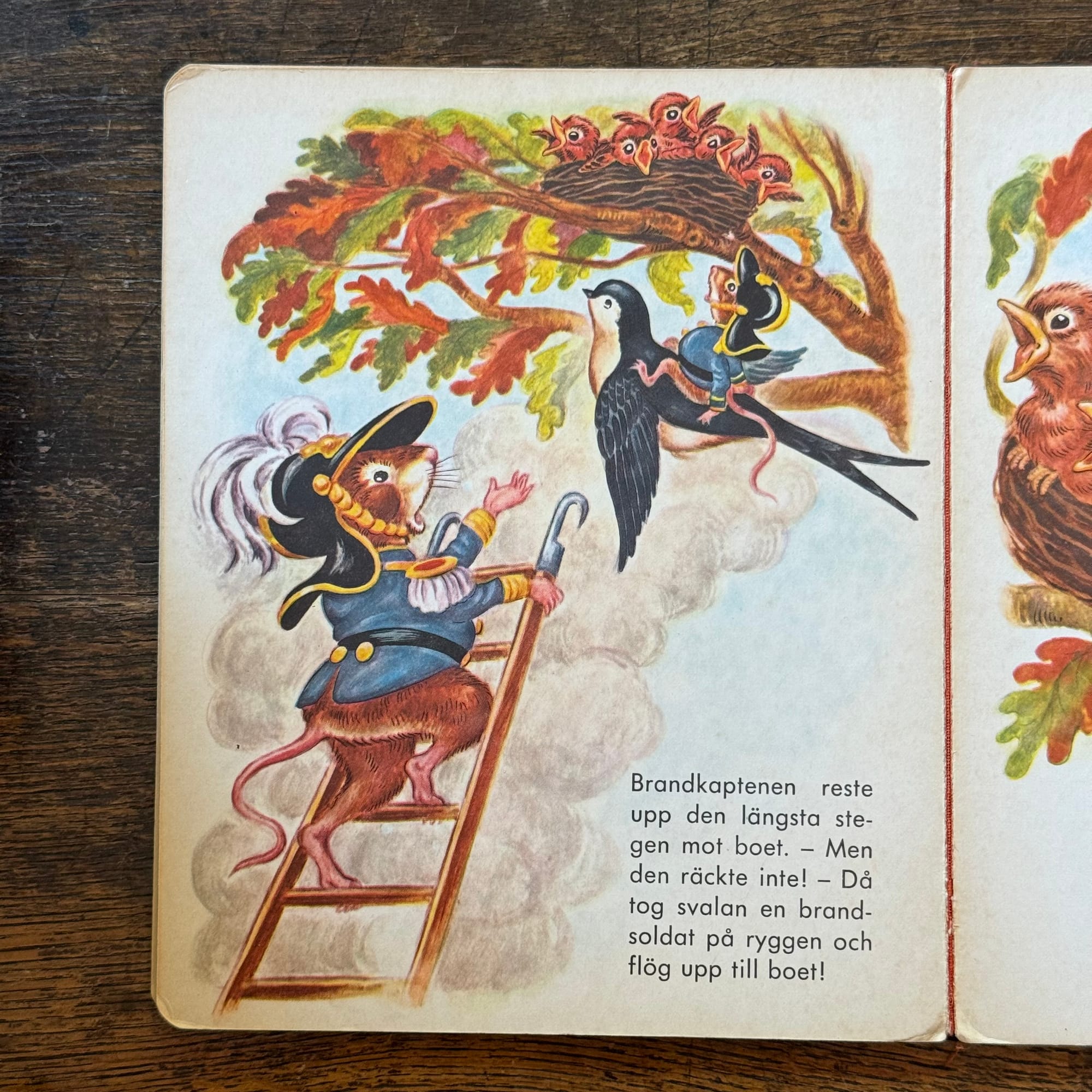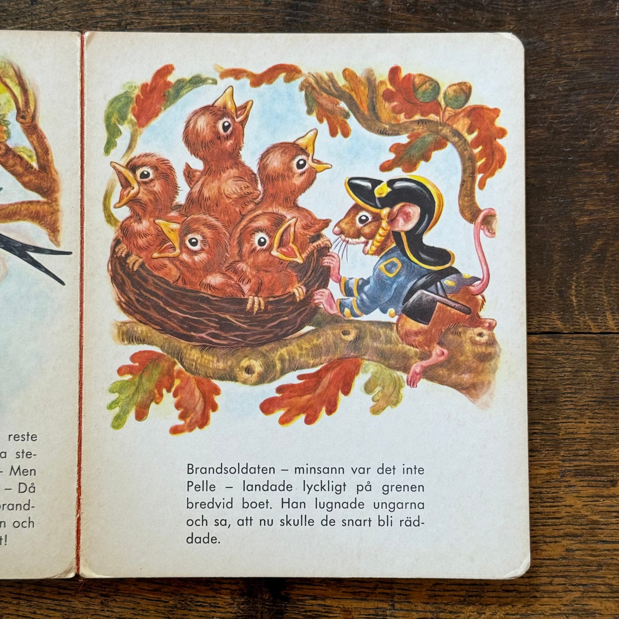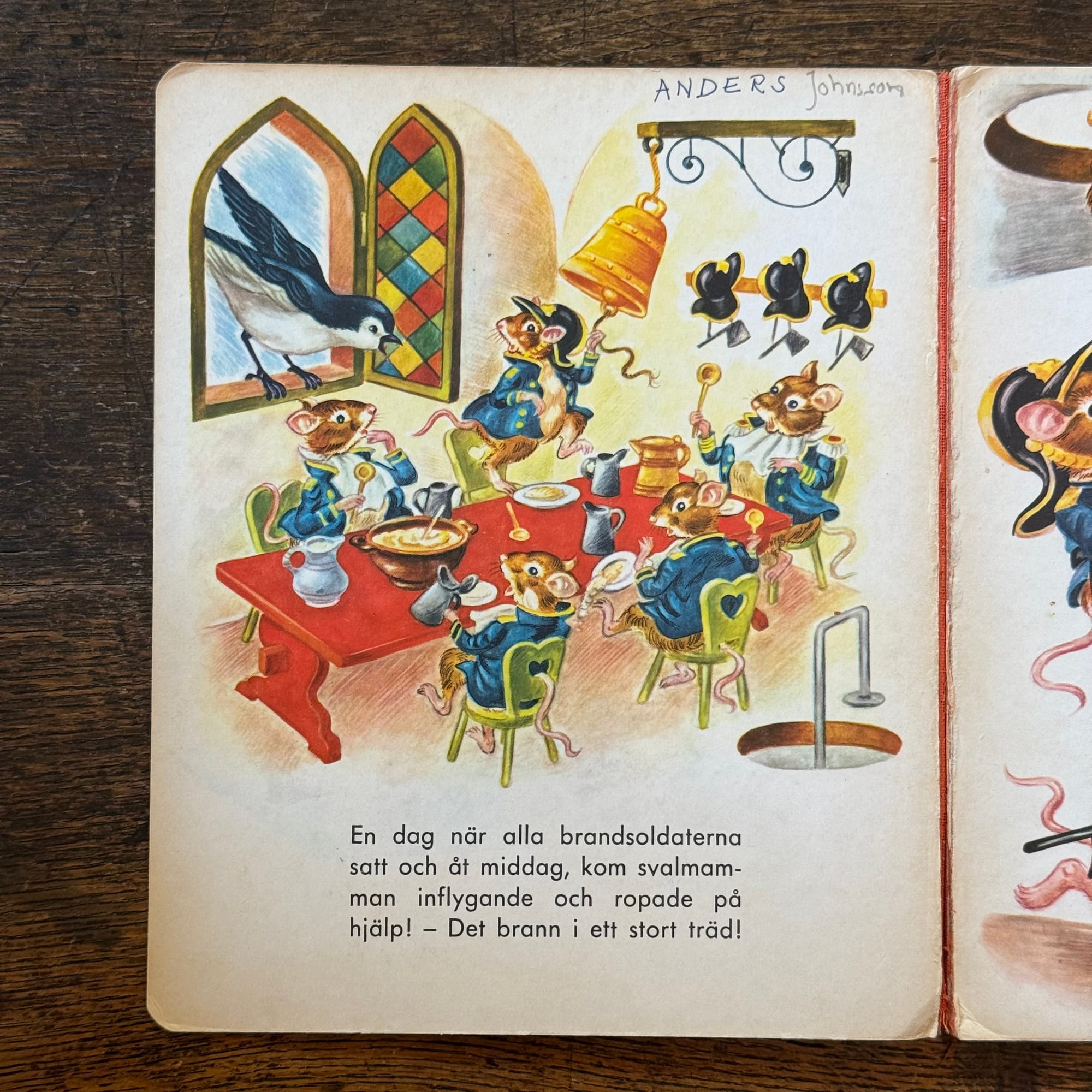Musbrandbilen rycker utEn dag när alla brandsoldaterna satt och åt middag, kom svalmamman inflygande och ropade pá hjälp! – Det brann i ett stort träd!Alarmklockorna började ringa och brandsoldaterna åkte ned för stången och kastade sig in i den röda, fina brandbilen.Men så sa lille Pelle, att han inte vågade följa med. Brandkaptenen blev mycket ond, och sa åt honom att fort hoppa upp och inte vara rädd!De körde mycket fort och tutade och plingade allt vad de kunde. Apan August försökte cykla ikapp brandbilen, men det lyckades inte.Så kom de fram till det stora trädet, som det brann i. Alla slangar kom kvickt fram och så hjälptes de åt att pumpa upp vatten ur sjön!En massa djur stod alldeles förskräckta och tittade upp i trädet, som det brann i! – Och nu fick de se ett svalbo fullt med ungar!Brandkaptenen reste upp den längsta stegen mot boet. – Men den räckte inte! – Då tog svalan en brandsoldat på ryggen och flög upp till boet!Brandsoldaten – minsann var det inte Pelle – landade lyckligt på grenen bredvid boet. Han lugnade ungarna och sa, att nu skulle de snart bli räddade.Fyra av brandsoldaterna höll upp ett stort segel nedanför trädet. Pelle tog ungarna en och en och lät dem hoppa ner i seglet.Så släckte de kvickt elden i trädet och alla djuren var så lyckliga! Svalungarna var iu räddade också och Pelle blev dagens hjälte!Bakre omslag, identiskt med främre så när som på förlagsloggan, se närmre nästa bild.Mulder, mjölnare på holländska, ett internet-anonymt holländskt förlag jag inte vet något om.