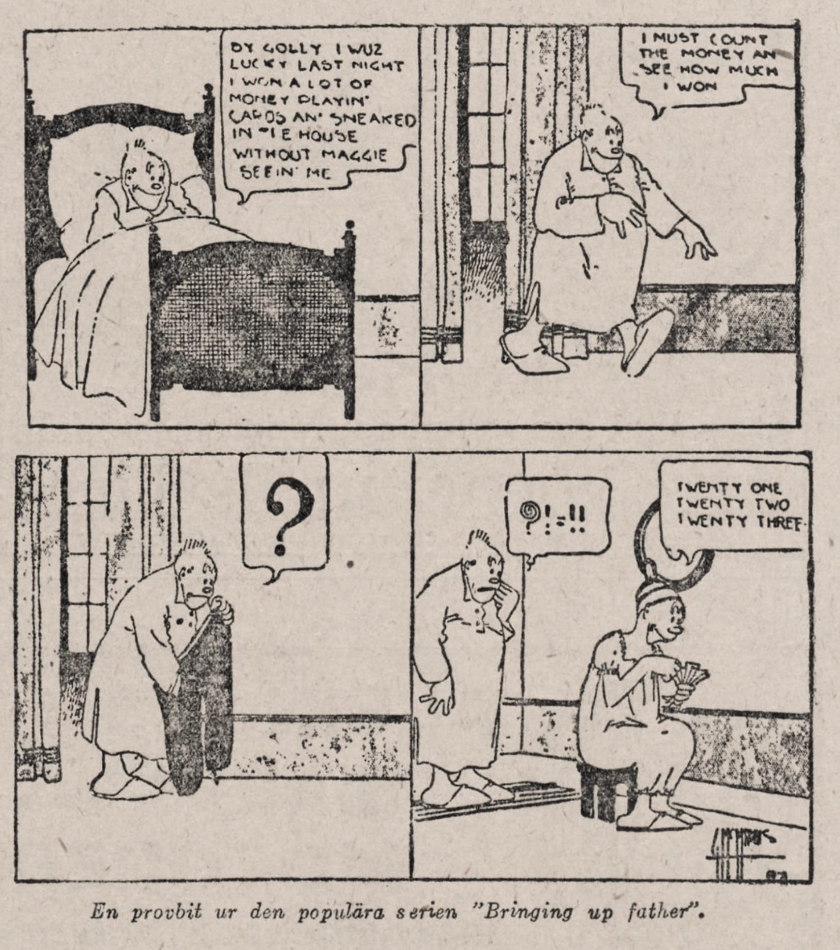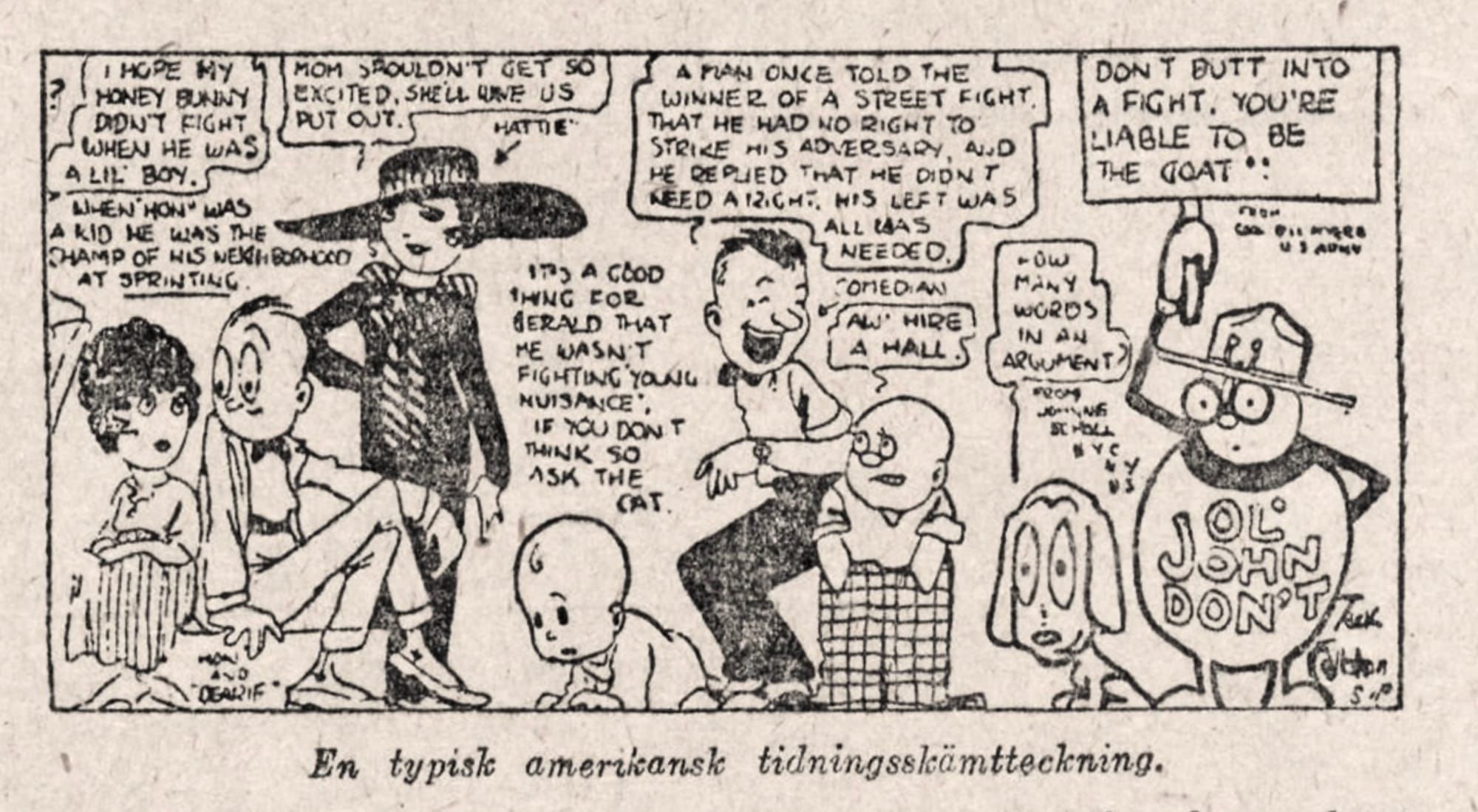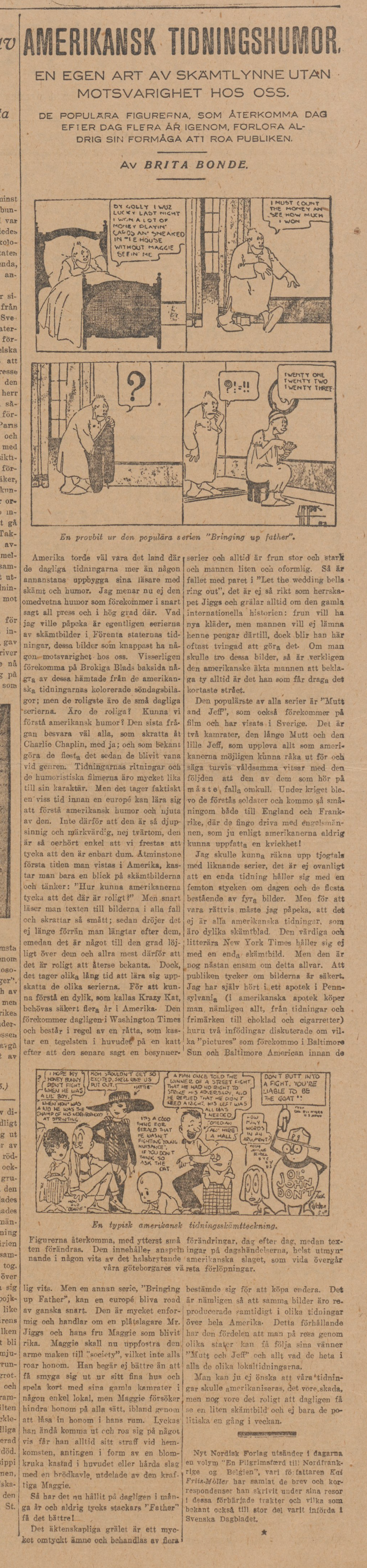 Amerika torde väl vara det land där de dagliga tidningarna mer än någon annanstans uppbygga sina läsare med skämt och humor. Jag menar nu ej den omedvetna humor som förekommer i snart sagt all press och i hög grad där. Vad jag ville påpeka är egentligen serierna av skämtbilder i Förenta staternas tidningar, dessa bilder som knappast ha någon motsvarighet hos oss. Visserligen förekomma på Brokiga Blads baksida några av dessa hämtade från de amerikanska tidningarnas kolorerade söndagsbilagor; men de roligste äro de små dagliga serierna. Äro de roliga? Kunna vi förstå amerikansk humor? Den sista frågan besvara väl alla, som skratta åt Charlie Chaplin, med ja; och som bekant göra de flesta det sedan de blivit vana vid genren. Tidningarnas ritningar och de humoristiska filmerna äro mycket lika till sin karaktär. Men det tager faktiskt en viss tid innan en europé kan lära sig att förstå amerikansk humor och njuta av den. Inte därför att den är så djupsinnig och märkvärdig, nej tvärtom, den är så oerhört enkel att vi frestas att tycka att den är enbart dum. Åtminstone första tiden man vistas i Amerika, kastar man bara en blick på skämtbilderna och tänker: ”Hur kunna amerikanerna tycka att det där är roligt?” Men snart läser man texten till bilderna i alla fall och skrattar så smått; sedan dröjer det ej länge förrän man längtar efter dem, emedan det är något till den grad löjligt över dem och allra mest därför att det är roligt att återse bekanta. Dock, det tager olika lång tid att lära sig uppskattade olika serierna. För att kunna förstå en dylik, som kallas Krazy Kat, behövas säkert flera år i Amerika. Den förekommer dagligen i Washington Times och består i regel av en råtta, som kastar en tegelsten i huvudet på en katt efter att den senare sagt en besynnerlig vits. Men en annan serie, ”Bringing up Father’’, kan en europé bliva road av ganska snart. Den är mycket enformig och handlar om en plåtslagare Mr. Jiggs och hans fru Maggie som blivit rika. Maggie skall nu uppfostra den arme maken till "society", vilket inte alls roar honom. Han begär ej bättre än att få smyga sig ut ur sitt fina hus och spela kort med sina gamla kamrater i någon enkel lokal, men Maggie försöker hindra honom på alla sätt, ibland genom att låsa in honom i hans rum. Lyckas han ändå komma ut cch roa sig på något vis får han alltid sitt straff vid hemkomsten, antingen i form av en blomkruka kastad i huvudet eller hårda slag med en brödkavle, utdelade av den kraftiga Maggie.