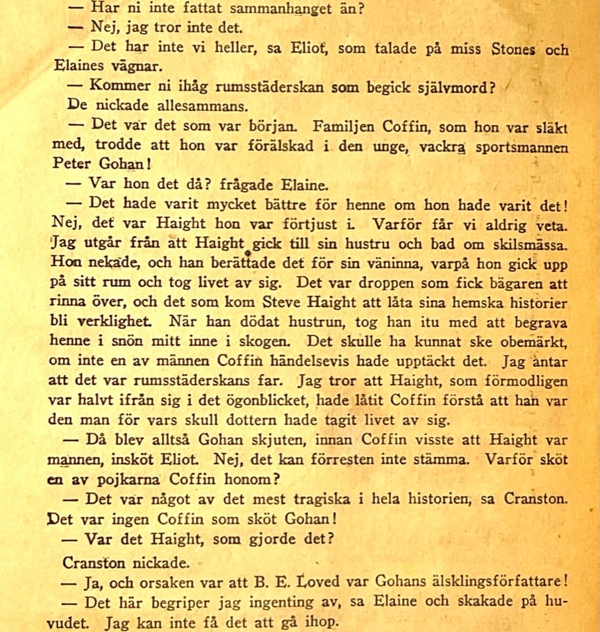 Historierna är relativt korta och rappt berättade, men det hindrar inte att intrigerna ibland blir en aning invecklade. Läs upplösningen* till den här historien, Döden på isen. Visst håller vi med Elaine? (Triggervarning: pulp!, mord, självmord, förvirrande intrig.)